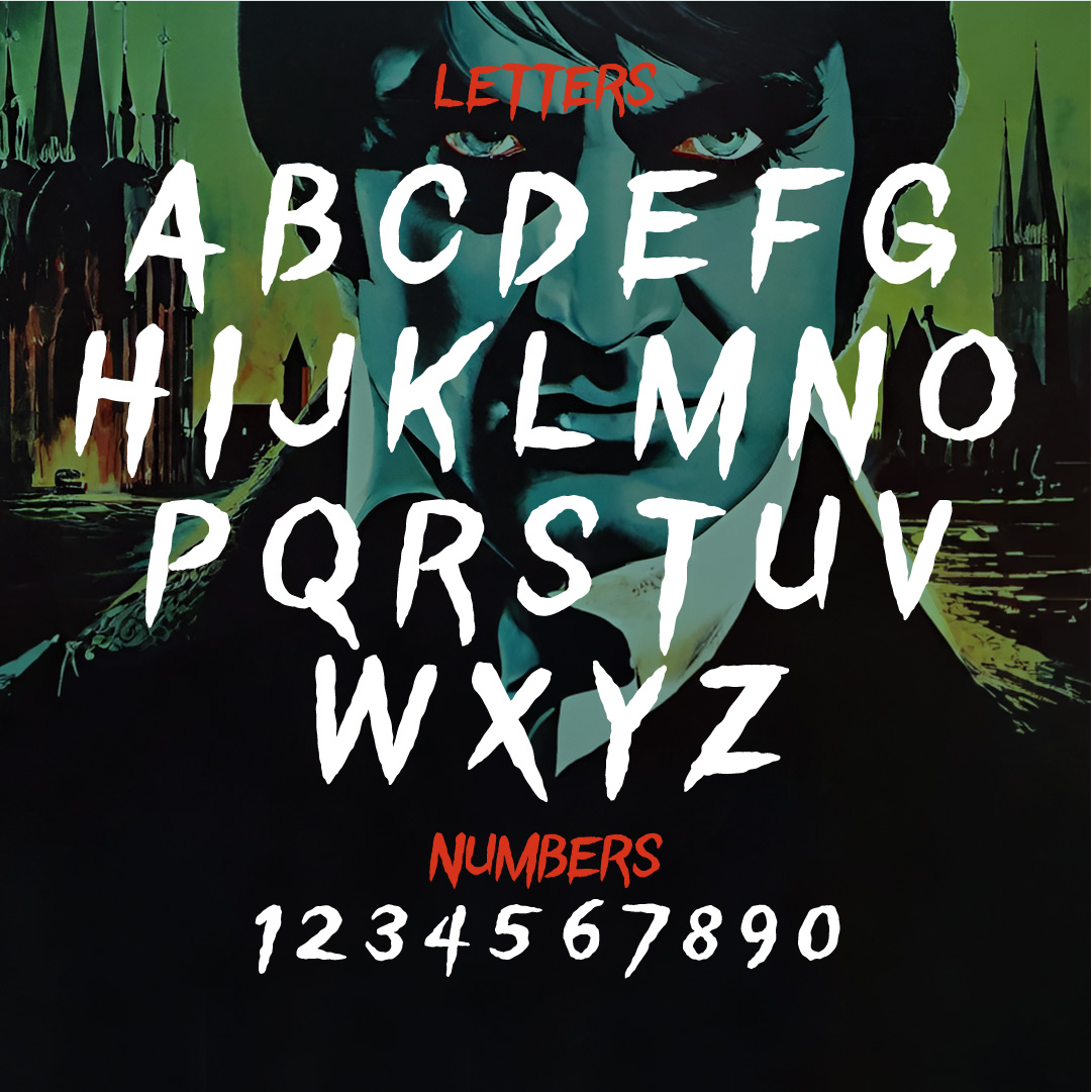 Introducing Fanger, the font that’ll make your text come alive… or should I say undead! This sharp vampire fang style typeface will send shivers down your readers’ spines as they peruse your chilling documents. With its jagged edges and sinister curves, Fanger embodies the essence of horror and darkness, perfect for Halloween invitations, haunted house posters, or anything that needs a touch of eerie elegance.
