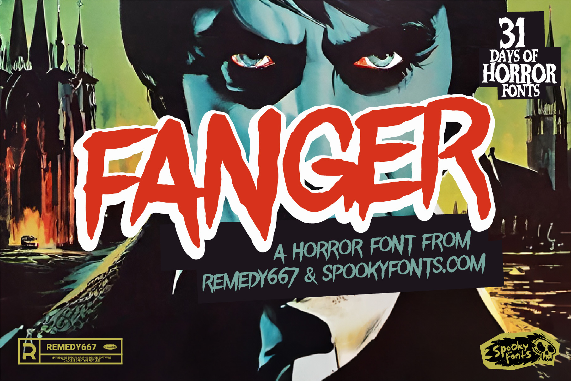 With Fanger on hand, unleashing your inner cryptkeeper has never been easier – it’s specifically crafted to enhance any macabre project with bone-chilling finesse. As you wield this wicked typeface like a vampire wields its fangs at night, prepare yourself for compliments from fellow monsters who know true darkness when they see it. So go ahead and embrace the macabre beauty of Fanger;