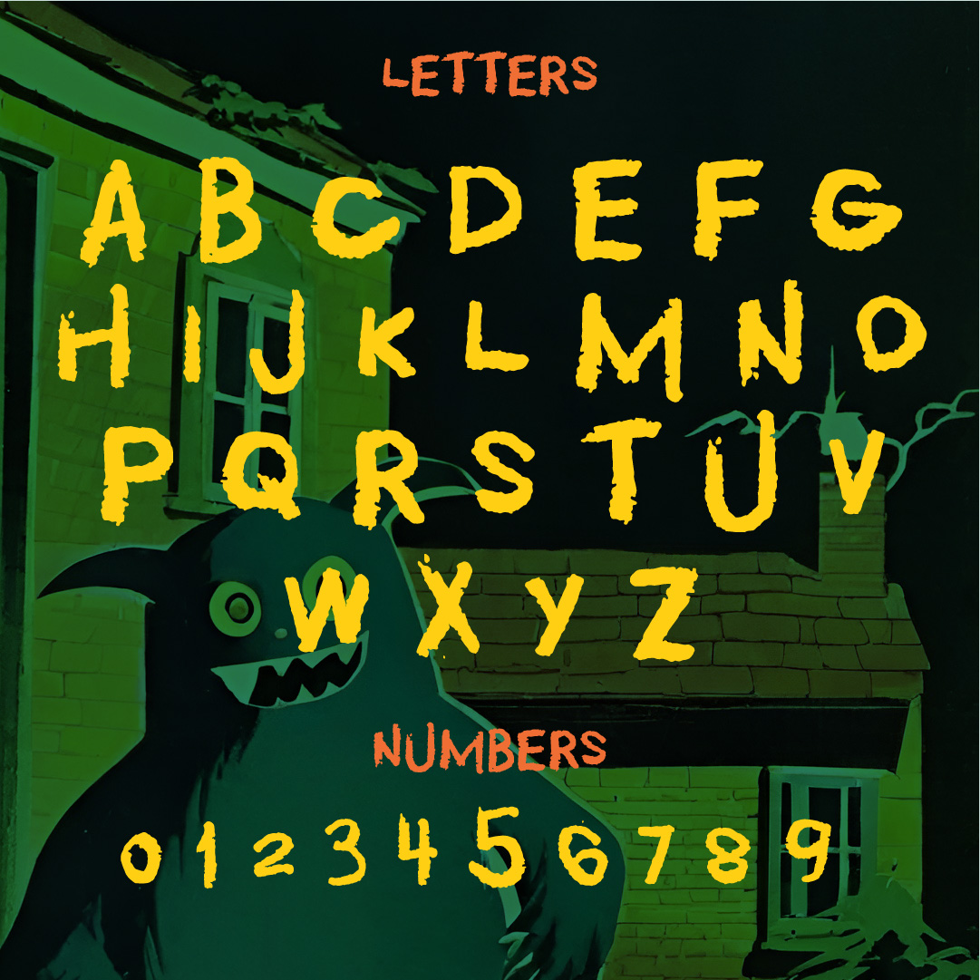 Introducing Scawy Monstuh, the frightfully delightful crayon scrawled spooky typeface that will send shivers down your spine! With its ghastly strokes and chilling curves, this bone-chilling font will bring a touch of macabre to all your design projects. Let the eerie charm of Scawy Monstuh enchant your audience with its haunted serifs and spectral descenders.